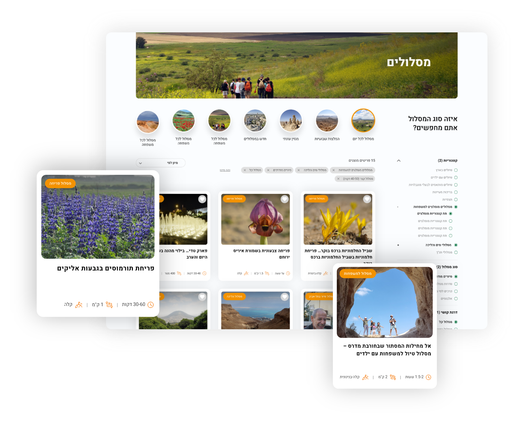 מעיינות, מסלולי הליכה, מסלולים למשפחות, אתרים, סיורים עירוניים, מסלולי פריחה, טיולים עם התנ”ך, תצפיות ועוד. - אפליקציה ואתר אינטרנט בחבילה אחת