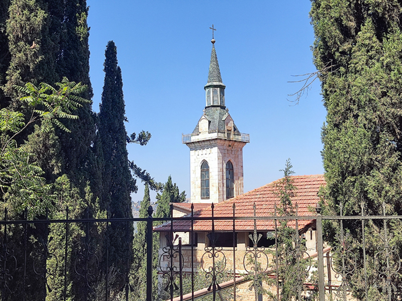 * נשקיף על כנסיית הביקור הקתולית, שנמצאת ממש מעבר לגדר.